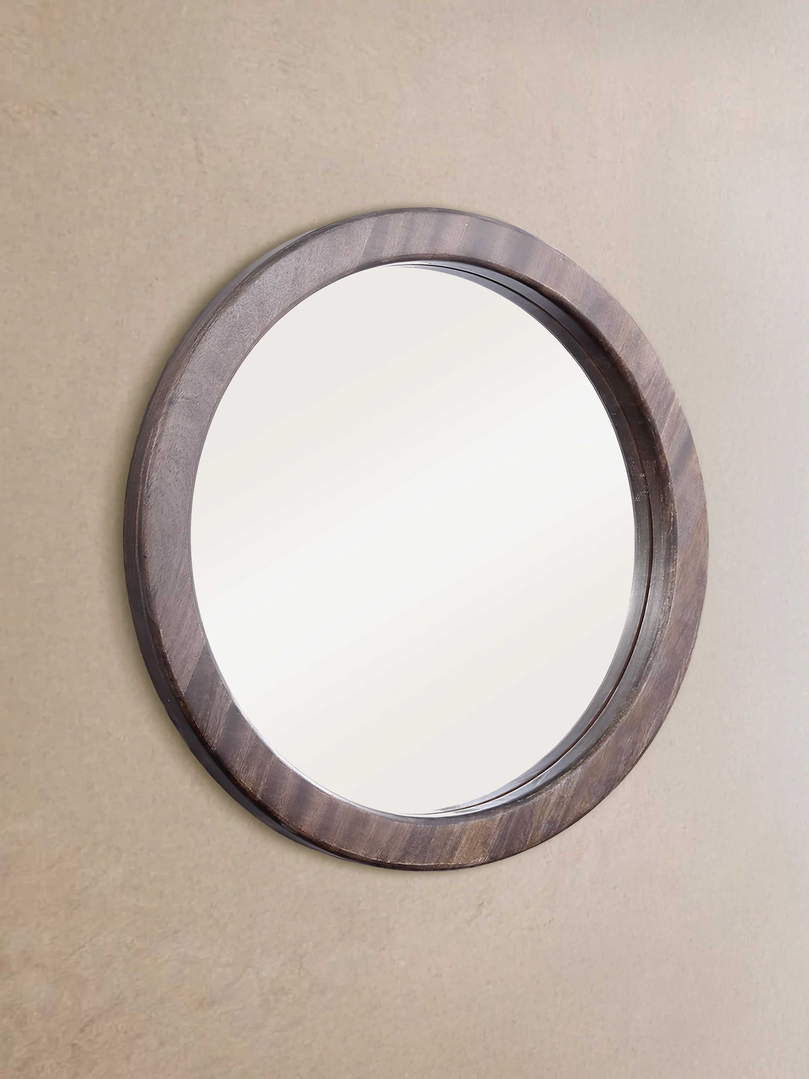 • Thick round wooden mirror with a timeless and elegant design
