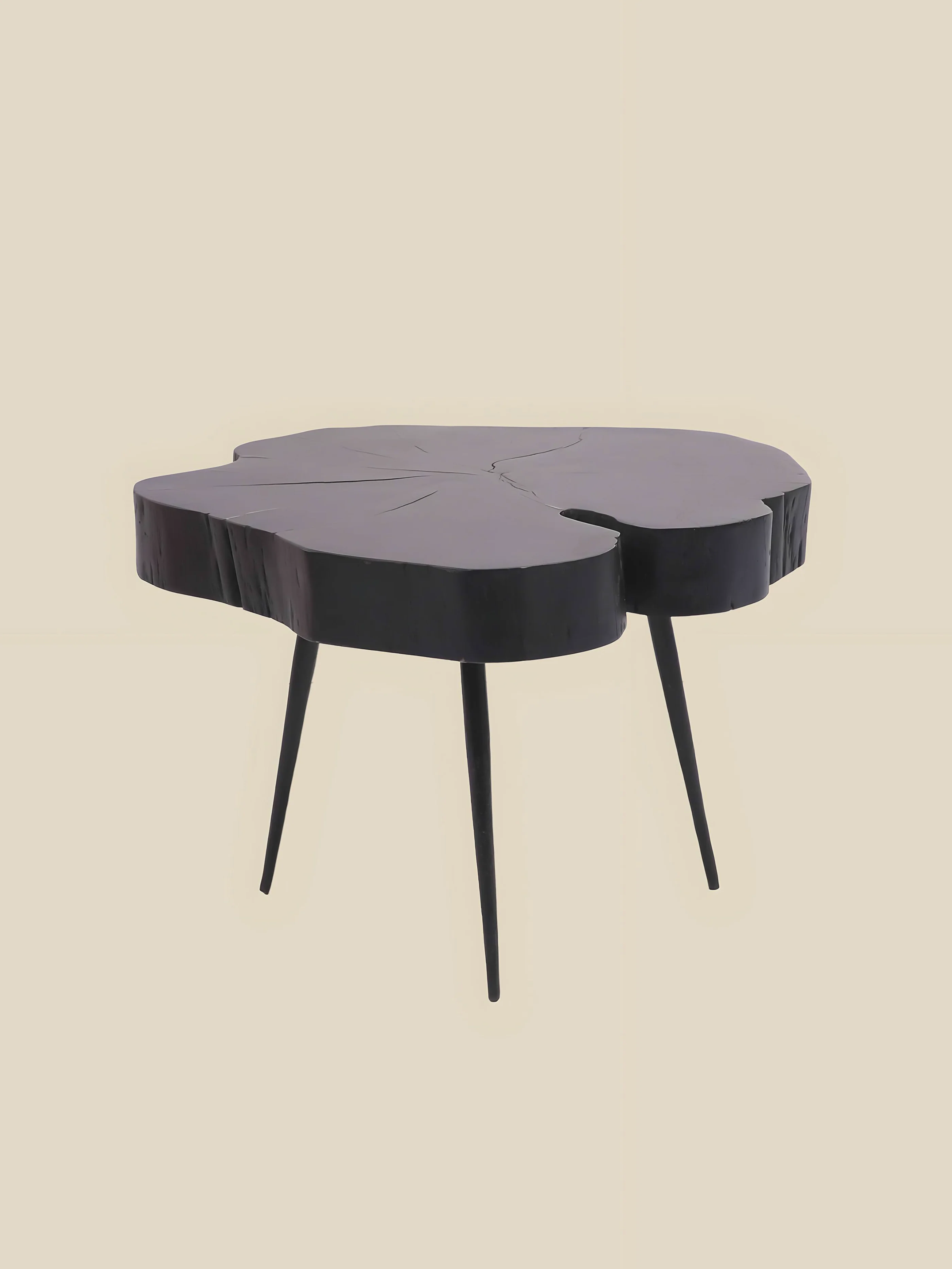 • Solid acacia wood top with a bold black finish for a sleek, organic look