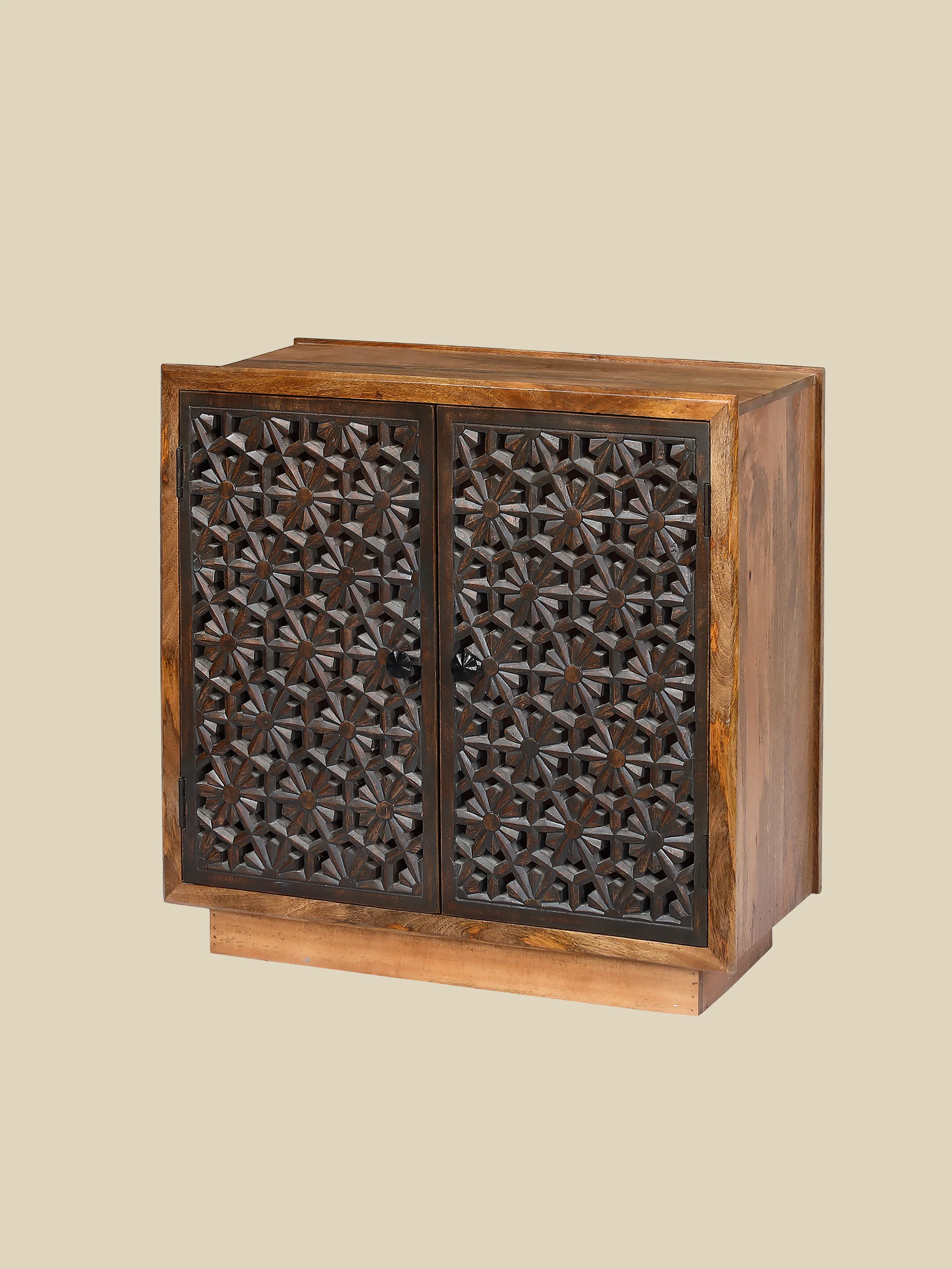 • Intricate floral cut-work doors with rustic metal accents